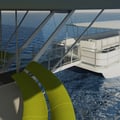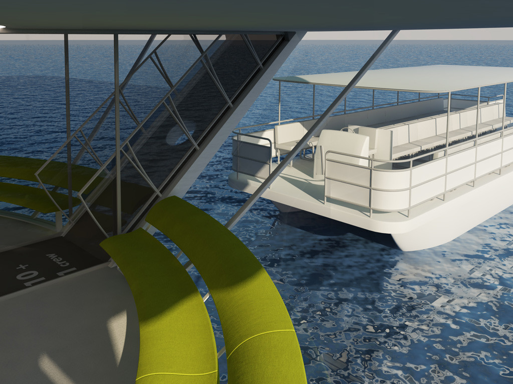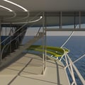 La passerelle à la toute extrémité du Flying-Yacht se déploie pour permettre l'embarquement des passagers. L'embarquement peut se faire par un bateau ou bien par un ponton aménagé.