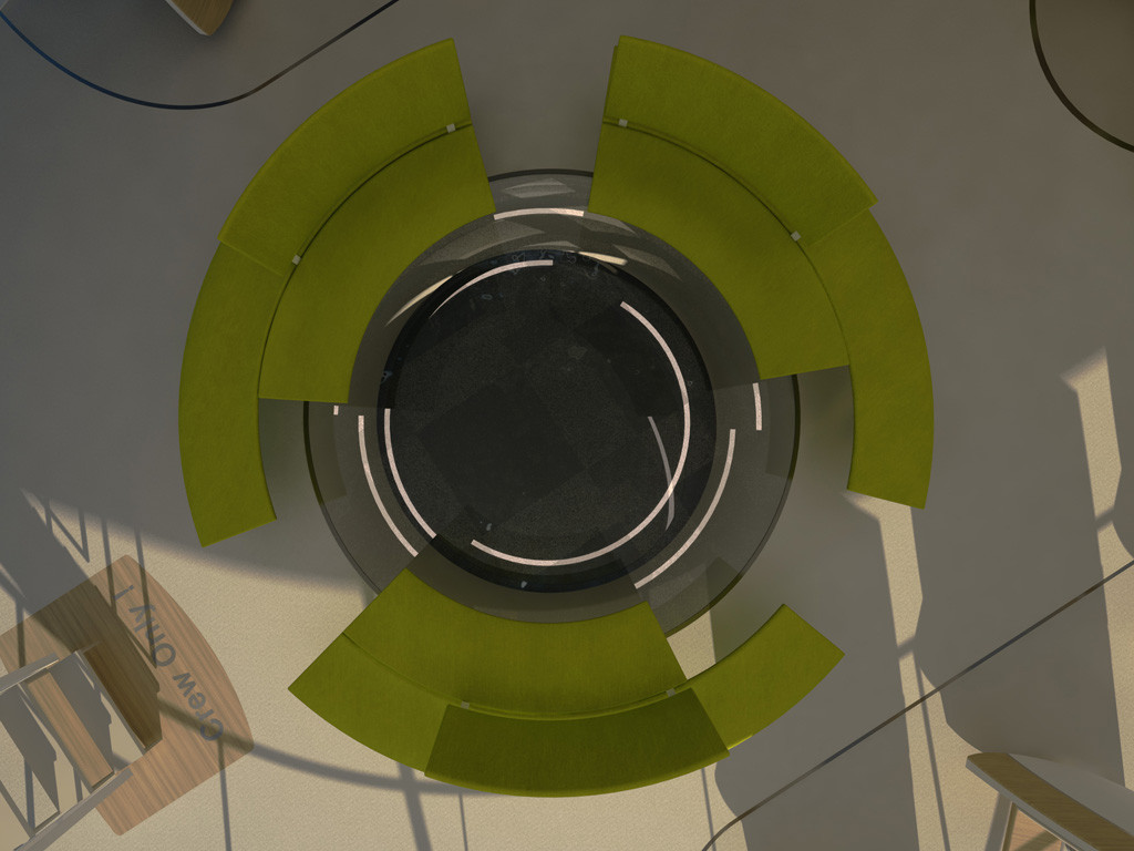 L'entrée des passagers à l'intérieur du sas se fait par groupe de 10 personnes plus un membre d'équipage. Grâce à son architecture, ce sas unique dessert aussi les 2 balcons extérieurs par deux escaliers. Le sas est ceinturé par des sièges panoramiques à l'arrière de l'aéronef.