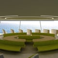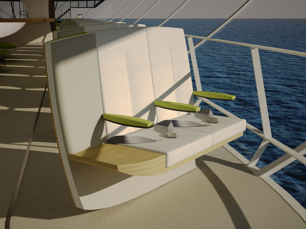 A l'avant de la cabine et de chaque coté, les sièges sont organisés selon deux rangées. Sur ce concept d'aménagement, quarante passagers peuvent prendre place. Les sièges sont tous orientés en diagonale vers l'extérieur de la cabine pour assurer une vue optimale à chacun des passagers, sans qu'ils ne soient aucunement gênés par les sièges situés à l'avant. Les sièges sont utilisés pour les phases d'atterrissage et de décollage, mais de part leur confort, ils peuvent être utilisés durant tout le vol.