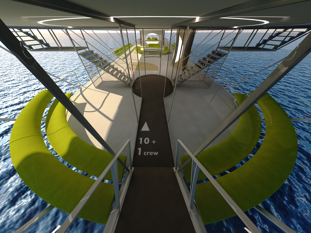 Deux larges ouvertures dans le sol avec un plancher transparent sont situées l'une à l'avant, l'autre vers l'arrière. Elles permettent une vision à la verticale durant le vol, ainsi qu'une vue sous marine lorsque le Flyingyacht est en mode bateau pour apprécier les fonds marins ou la faune aquatique. Les banquettes qui entourent ces perforations permettent de s'assoir au dessus de l'ouverture pour profiter pleinement de la vue.