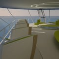 Une paire de balcons se trouvent de chaque coté du fuselage du Flying-Yacht. Ils se déploient et permettent d'apprécier le plein air lorsque l'aéronef est posé sur l'eau.