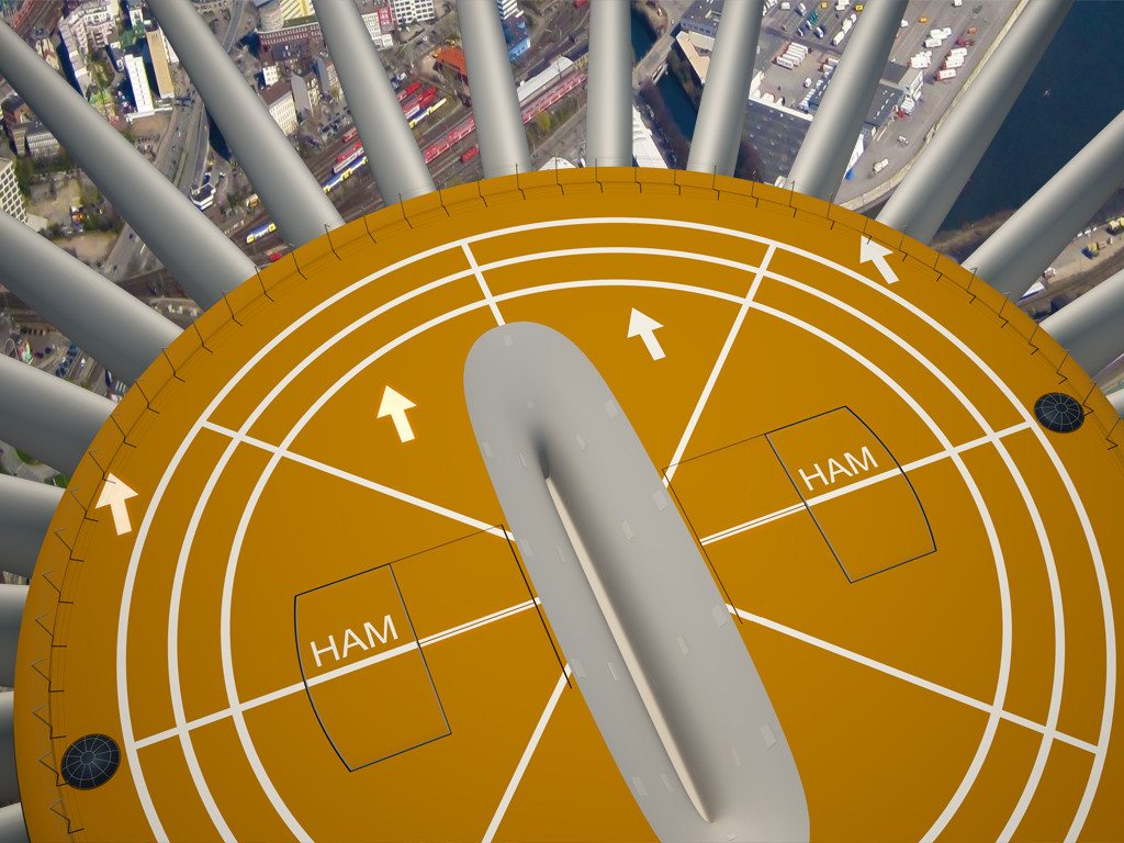 Le sommet de la tour est aménagé pour accueillir un appareil à atterrissage vertical spécialement conçu.