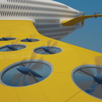 Dans les phases de décollage et d'atterrissage, les 24 moteurs de l'A3000 basculent à l'horizontale et l'engin se comporte alors exactement comme un hélicoptère, capable de tenir le vol