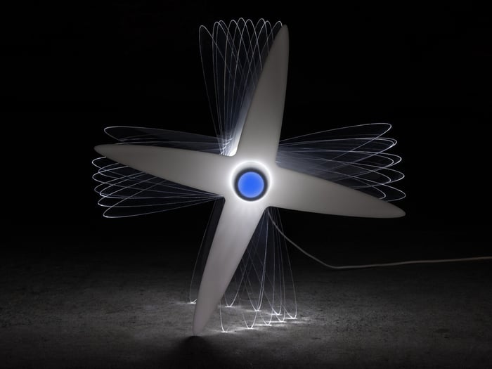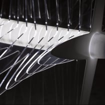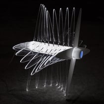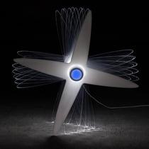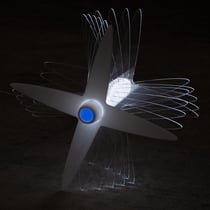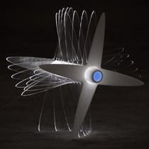 Progression dans le temps et l’espace, décomposition du mouvement, cette série de sculptures lumineuses a été initiée par l’observation des rotations des hélices, des ailettes de réacteurs, comme une contemplation stroboscopique des moteurs d’avions, des tourbillons des hélices de bateaux.